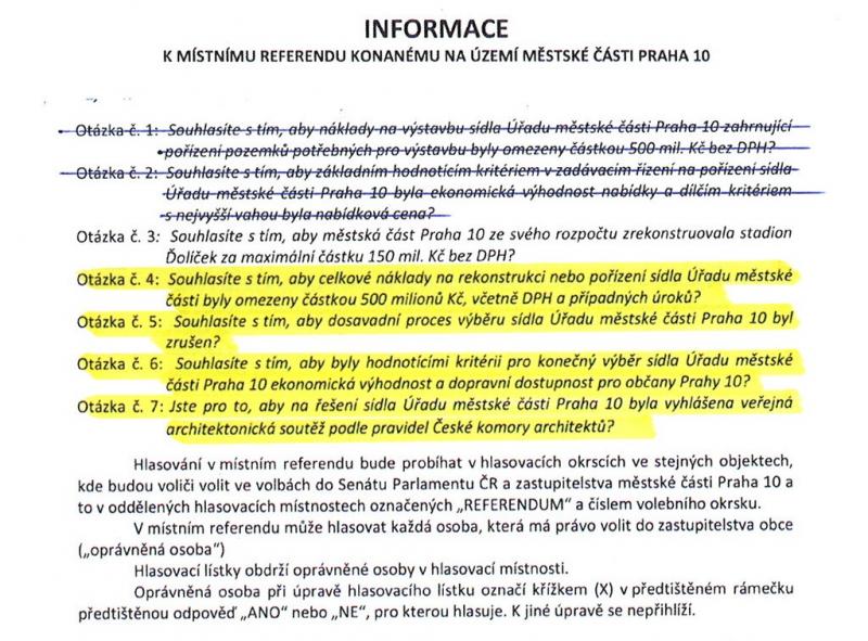 1) otázky, které si zvolili lidé v referendu STOP MILIARDOVÉ RADNICI, jsou skryty pod čísly 4, 5, 6, 7. To jsou stejné otázky, pod které se podepsalo přes jedenáct tisíc občanů Prahy 10, a které podal přípravný výbor na úřad. Jsou zvýrazněné žlutě. Doporučujeme hlasovat.